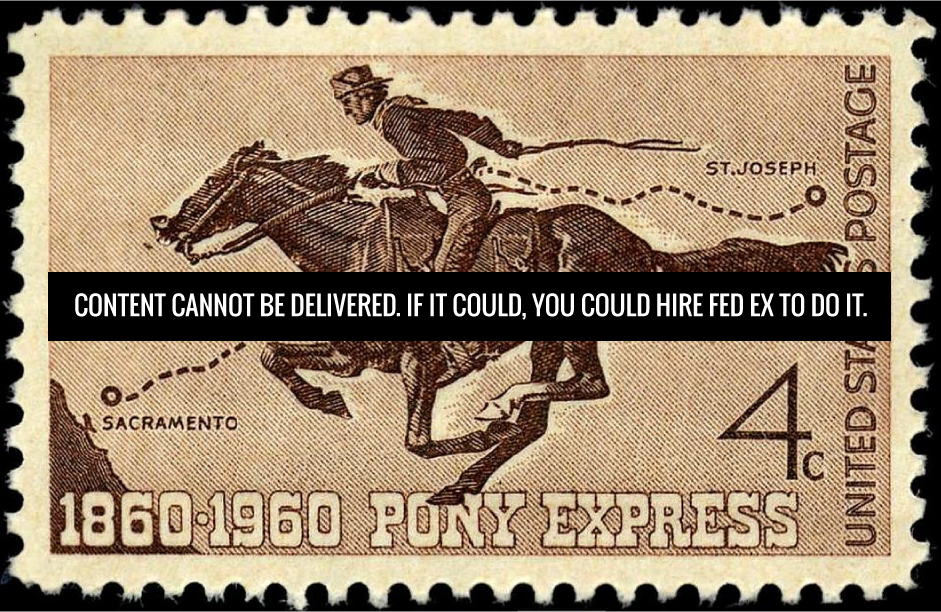 Content cannot be delivered. If it could, you could hire FedEx to do it. Content is usually spoken about as if it were a physical object. It isn’t. But, content is not a physical object. In a book, the content is the same no matter whom it is delivered to. Socrates warned about this when the written word became commonplace saying that the words can’t defend themselves. But when we talk with one another we say different things to different people and respond to what they ask about and try again. Still content I suppose, but now it can’t be delivered in that FedEx (or MOOC) sort of way.