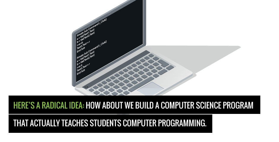 So my idea boils down to this: Let undergraduates do what they came to college to do. In computer science this is rather simple actually. They love computers in the first place so let professors simply help students do interesting things that make them able to build a product and run their own company, or else become valuable employees in a company that might employ them.